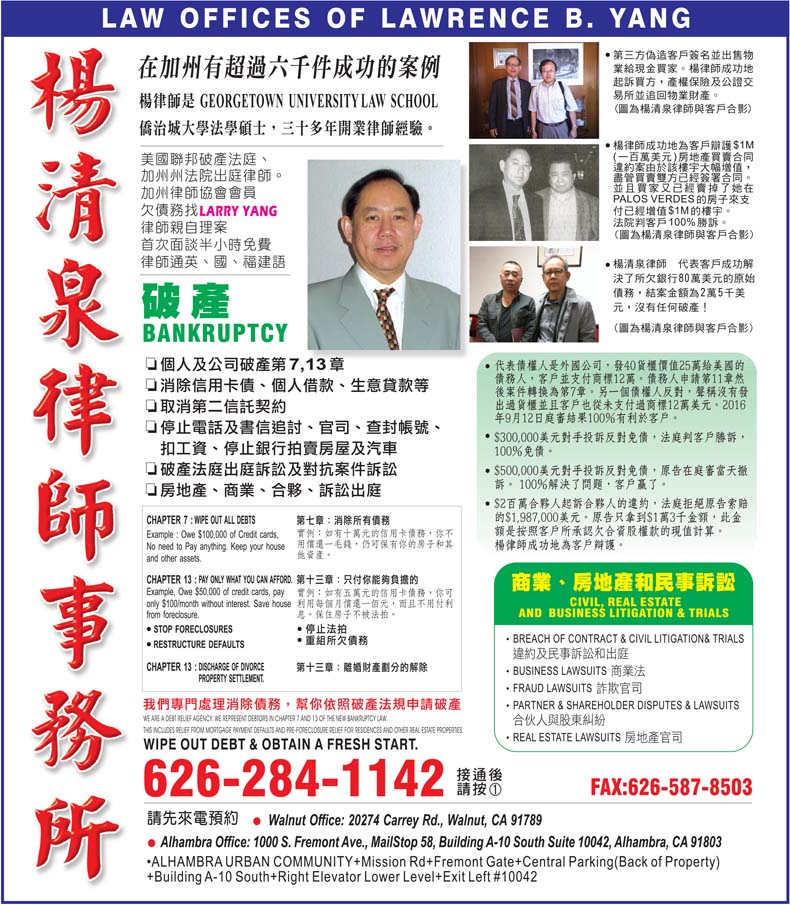 杨清泉律师事务所,成功案例分享:1.成功案例:第三方伪造客户签名并出售物业给现金买家。杨律师成功地起诉买方、产权保险及公证交易所并追回物业财产。2.成功案例:杨律师成功地为客户辩护$1M(一百万美元)...