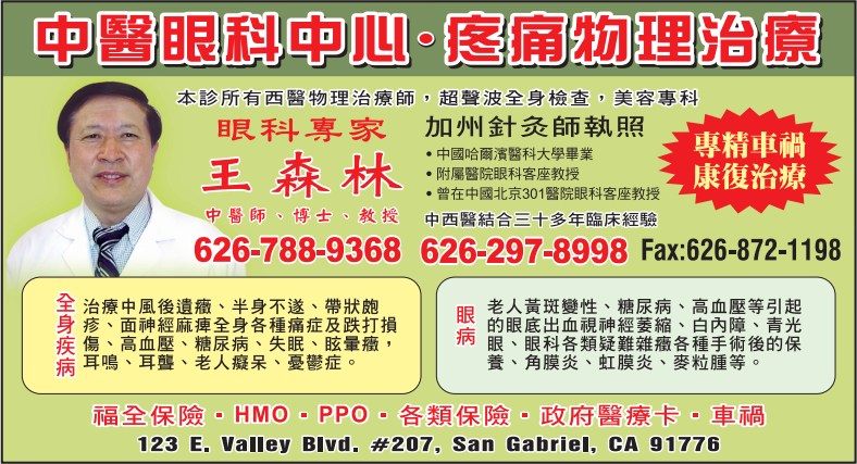 王森林醫療中心/SENLIN WANG MEDICAL CLINIC CORP.專精於中醫‧針灸。王森林醫療中心/SENLIN WANG MEDICAL CLINIC CORP.的辦公地址在123 E. Valley Blvd., #207, San Gabriel, CA, 91776,公司電話是(626) 297-8998,公司營業時間MON-FRI(10-6)該商家的關鍵詞包含:鐵打損傷 足底按摩 全身推拿