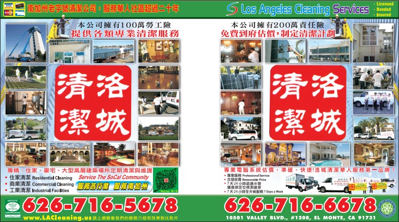 擁有多年豐富的清潔經驗,始終提供高品質服務的清潔公司----洛城清潔。洛城清潔是一家完全由華人提供清潔、洗地毯、地板打蠟、水壓清潔、垃圾清運及汽車內外全方位清潔保養等綜合性服務的公司。