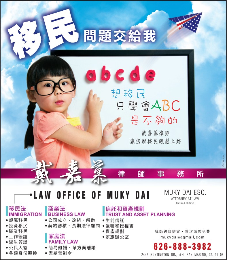 戴嘉慕律師事務所/DAI, MUKY, ATTORNEY AT LAW專精於律師,律師-移民服務。戴嘉慕律師事務所/DAI, MUKY, ATTORNEY AT LAW的辦公地址在2445 Huntington Dr., #H, San Marino, CA, 91108,公司電話是(626) 888-3982,公司營業時間MON-FRI(9-5)該商家的關鍵詞包含:投資移民 職業移民 PERM 各類簽證 身份轉換 未婚夫妻 婚姻綠卡 公民入籍 面談翻譯 補件上訴 親屬移民 綠卡 工作簽證 護士移民 宗教人士移民 移民律師 夫妻簽證 移民排期 入籍試題 美國律師 O簽證 翻譯文件 MUKY DAI