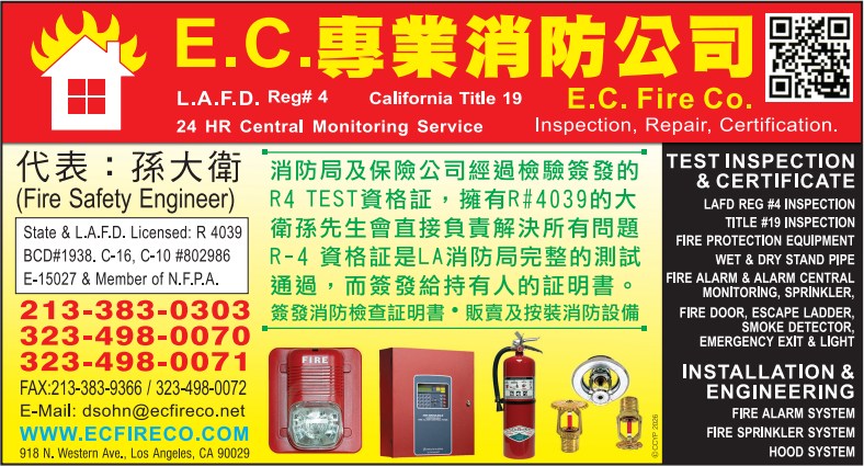 E.C. FIRE CO.專精於消防設備。E.C. FIRE CO.的辦公地址在918 N. Western Ave., Los Angeles, CA, 90029,公司電話是(323) 498-0070,公司營業時間MON-FRI(8-4:30)他們的網站是ecfireco.net。該商家的關鍵詞包含:FIRE SPRINKLER FIRE ALARM INSTALLAOTION REPAIRS SERVICE CERTIFICATION 消防設備 消防器材